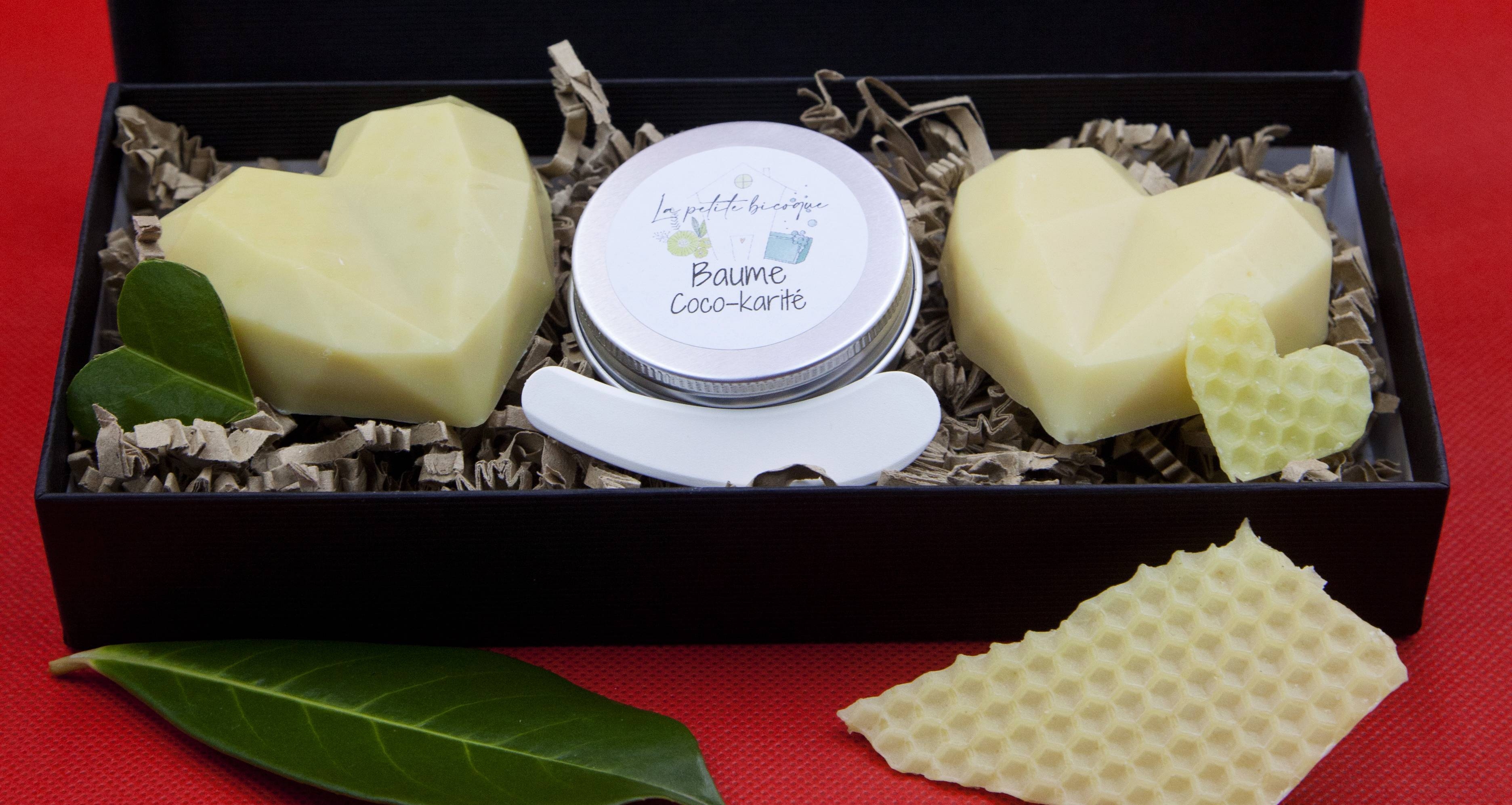Coffret cadeau comprenant 2 savons de 50g et un baume :